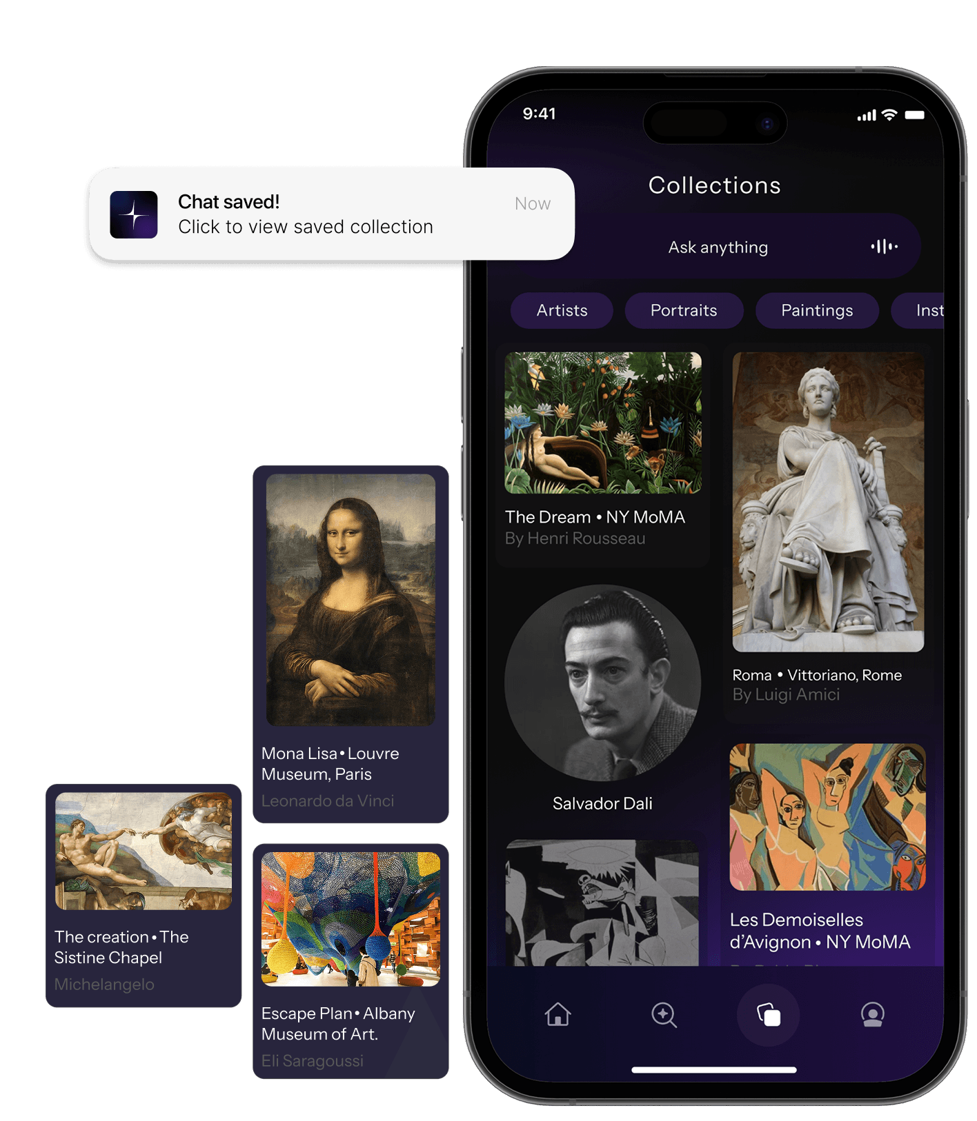 You can save artwork interactions, artist personalities, and ongoing conversations for future exploration and interaction.