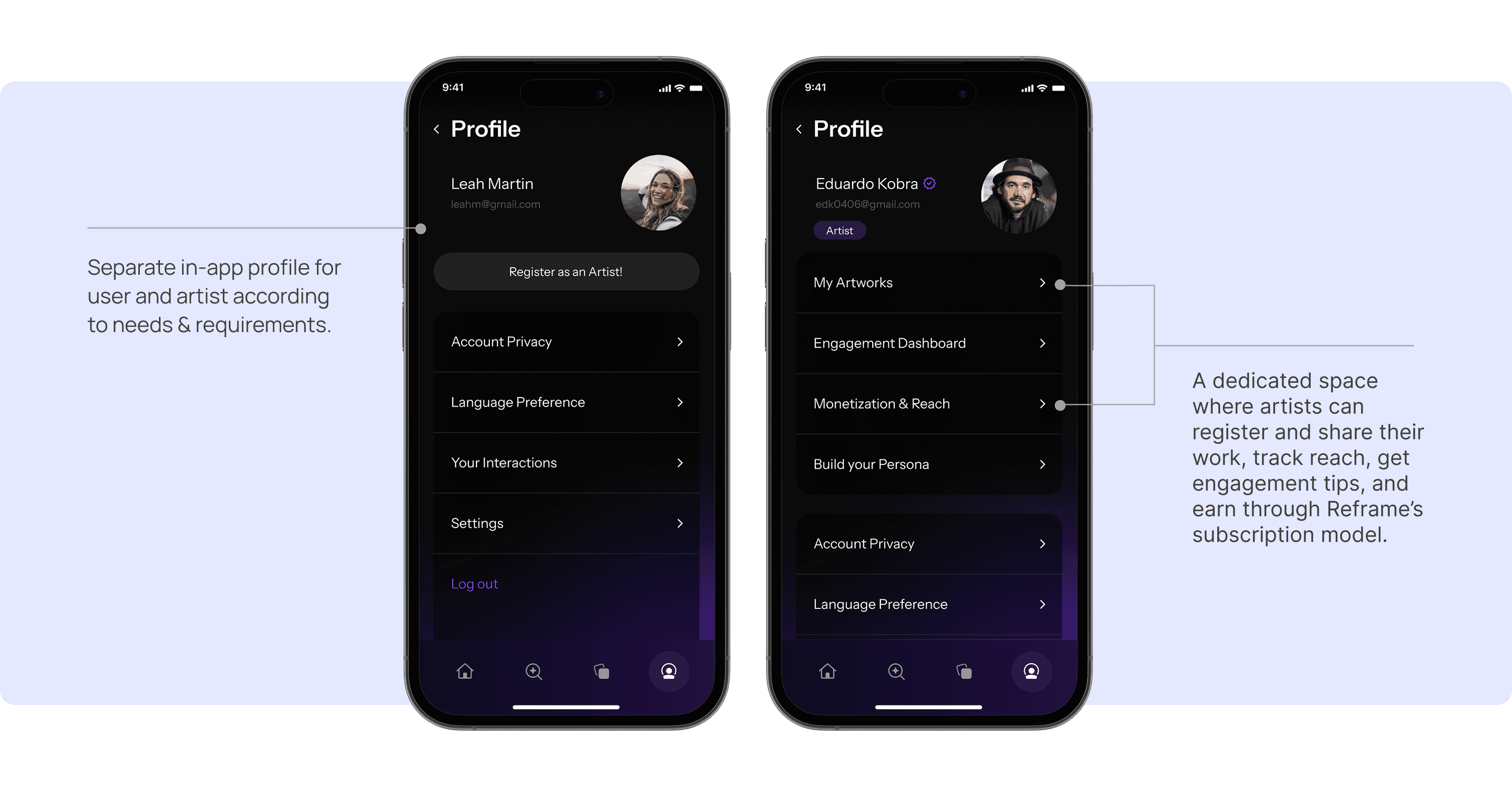 I led Reframe.Ai’s design strategy and conceptualization transforming research insights into intuitive, AI-powered interactions and a cohesive brand identity that brings every artwork’s story to life.
