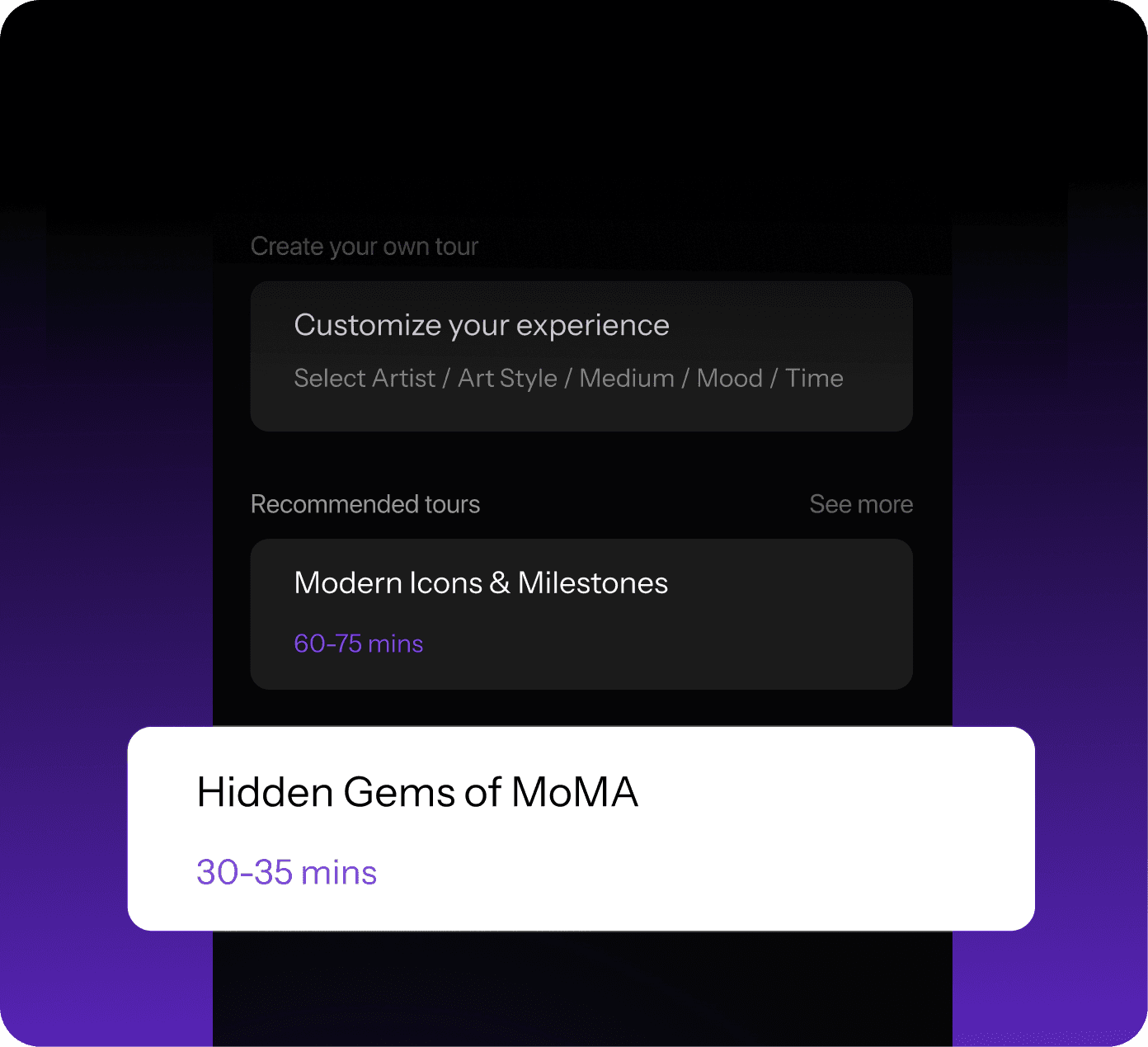 Option to select from the AI-curated museum tours that adapt to your interests, time constraints and knowledge level, replacing generic audio guides.