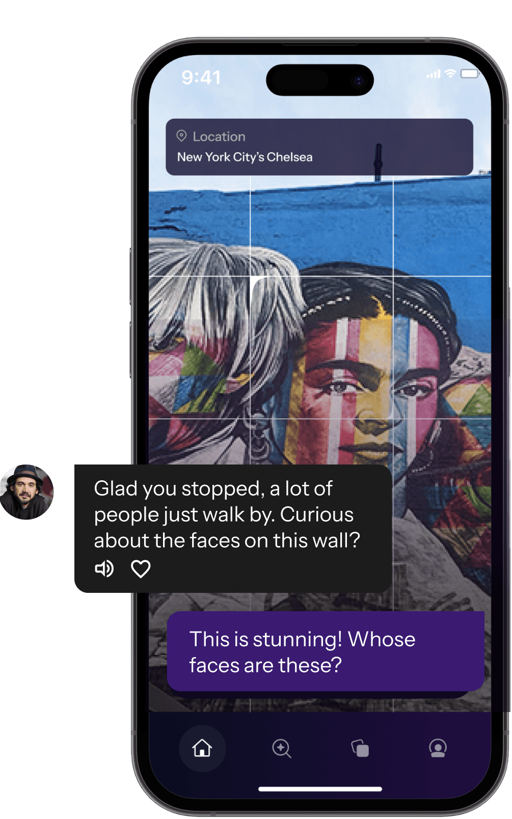 AI-initiated conversations that represent artist personality and perspectives, allowing you to ask questions and explore artwork meaning